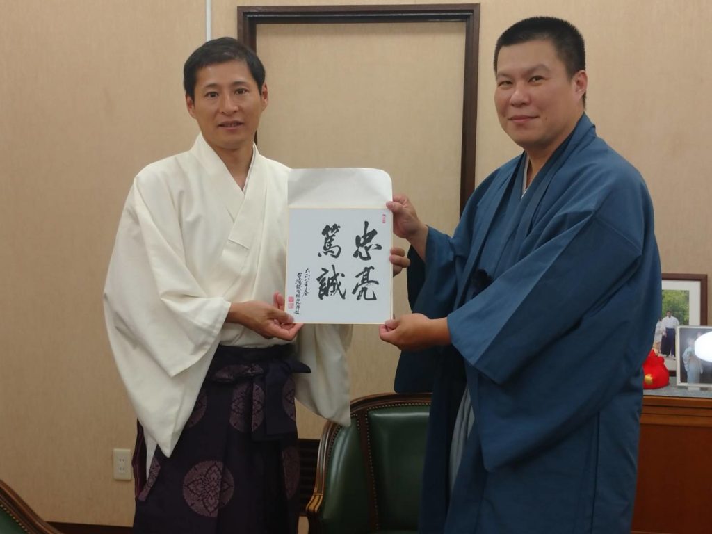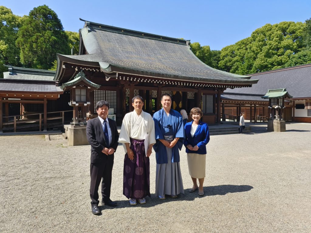 午後、陳さんは、同協会副会長である清水志摩子清水園代表取締役とともに、大宮氷川神社を訪問し、東角田真臣権宮司と対談され、台湾の日本神社の建築様式、日本神社関係者の台湾訪問状況などについて話しました。また、同神社本殿にて正式参拝をされました。また、台湾檜を用いた同神社二の鳥居を参観しました(色紙の揮毫は、明石総督のものを複製)。