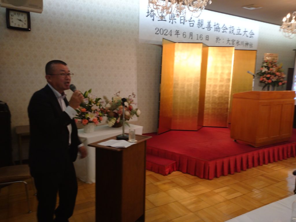 当会会員である関口昌一参議院議員、古川俊治参議院議員、村井英樹衆議院議員、黄川田仁志衆議院議員の4名の方、高市早苗衆議院議員からそれぞれ祝電をいただきました。台湾駐日代表処横浜分処の張淑玲処長、台湾明石会の朱家煌理事長、陳凱鈞事務局長、吉田みく様から、それぞれお花をお贈りいただきました。みなさま、ありがとうございました。司会は、鈴木正人理事(埼玉県議会議員、県議会日台議員連盟会長)が行いました。