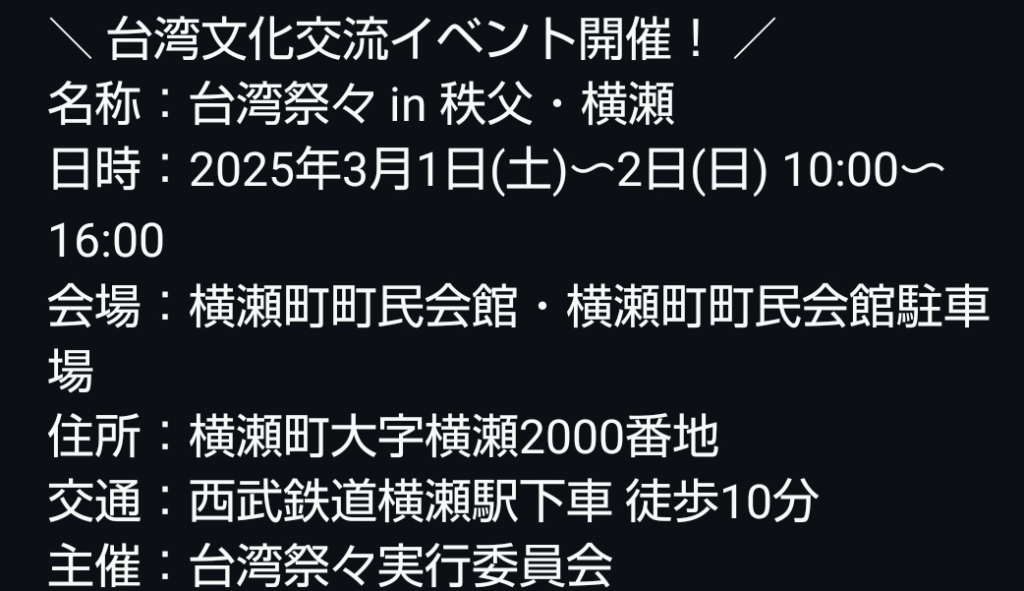 秩父の南に位置する横瀬町で、台湾文化交流ベントが開催されます(3月1~2日)。