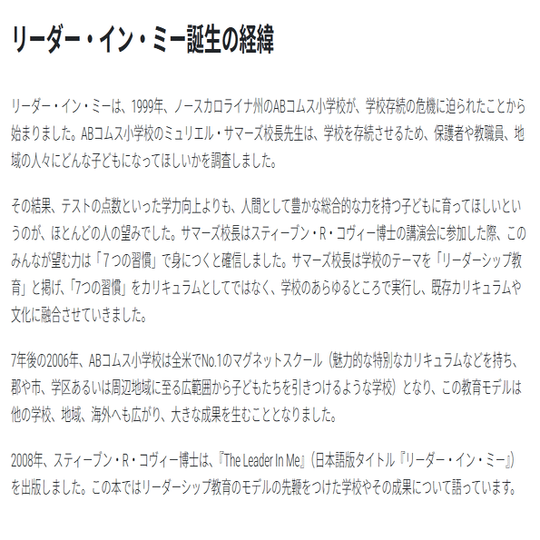 7つの習慣はビジネスの原則として、アメリカのスティーブン・コヴィーが提起したものです。教育にも有用ということで、全世界60国の約7000の小中高学校でも活用されています。リーダー・イン・ミーと称され、日本では、約60校で導入されています。