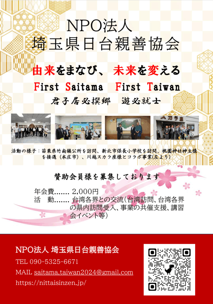 「NPO法人埼玉県日台親善協会」の賛助会員への加入のご案内をさせていただきます。